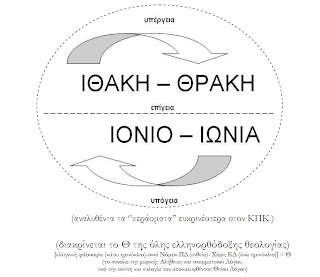 τύπωση του σημείου του Σταυρού πάνω στην Ελλάδα. Εις το όνομα του Πατρός - κεφαλή (Θράκη) - και του Υιού - κοιλία (Κρήτη) (όπου ''αναλογικά'' κατέβηκε ο Θησέας για να νικήσει τον μινώταυρο και ελευθερώσει τους νέους και νέες) και του Αγίου Πνεύματος από ΙΟΝΙΟ στην ΙΩΝΙΑ. Όπου ο σπόρος Ι(Ο)ΝΙΟ προοδεύει μέχρις τελειώσεως Ι(Ω)ΝΙΑ, όπως και ο σπόρος μέσα σε κάθε