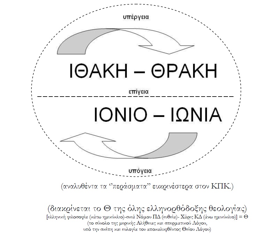 τύπωση του σημείου του Σταυρού πάνω στην Ελλάδα. Εις το όνομα του Πατρός - κεφαλή (Θράκη) - και του Υιού - κοιλία (Κρήτη) (όπου ''αναλογικά'' κατέβηκε ο Θησέας για να νικήσει τον μινώταυρο και ελευθερώσει τους νέους και νέες) και του Αγίου Πνεύματος από ΙΟΝΙΟ στην ΙΩΝΙΑ. Όπου ο σπόρος Ι(Ο)ΝΙΟ προοδεύει μέχρις τελειώσεως Ι(Ω)ΝΙΑ, όπως και ο σπόρος μέσα σε κάθε